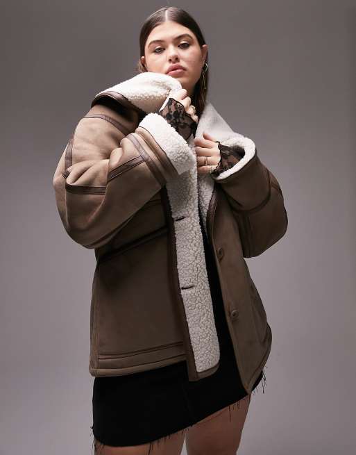 Topshop Curve – Jasnobrązowy płaszcz oversize z kremowym sztucznym kożuszkiem