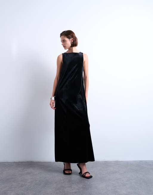 Topshop – Czarna aksamitna sukienka maxi z zabudowanym dekoltem i odkrytymi plecami