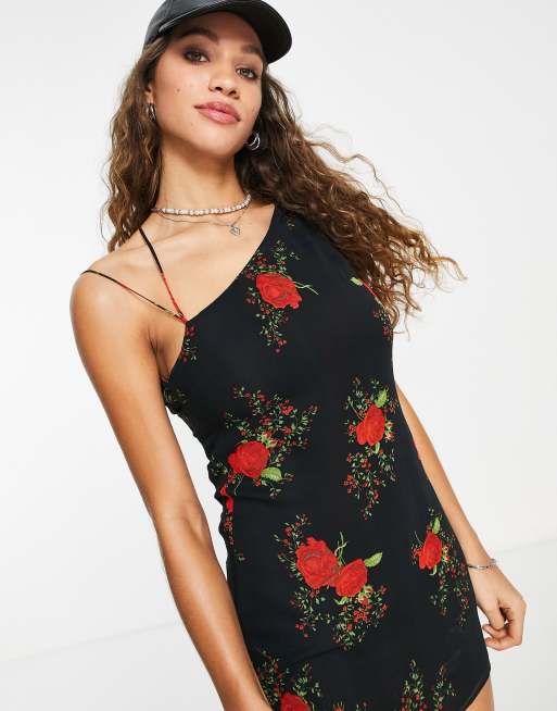 Topshop – Czarna asymetryczna sukienka mini na ramiączkach z drapowanym dekoltem i nadrukiem w róże