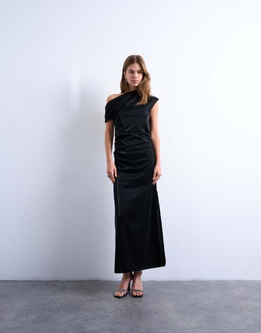 Topshop – Czarna opalizująca sukienka maxi z odsłoniętym ramieniem