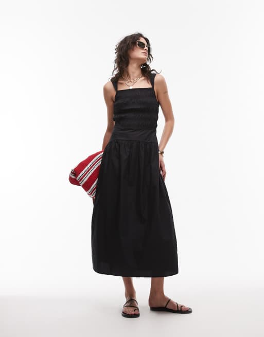 Topshop – Czarna popelinowa sukienka midi z marszczoną górą