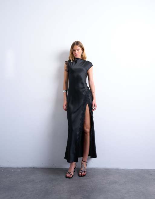 Topshop – Czarna satynowa sukienka maxi z drapowanym dekoltem i koronkowym wykończeniem