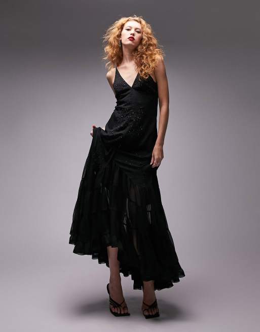 Topshop – Czarna zdobiona sukienka maxi na ramiączkach z dekoltem w szpic