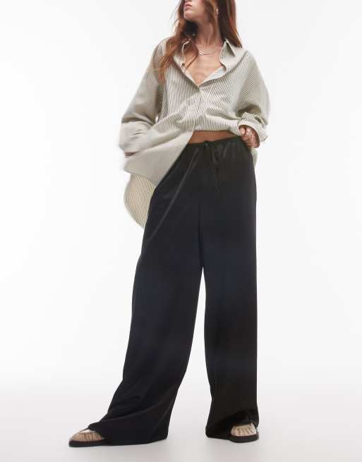 Topshop – Czarne satynowe spodnie ściągane na sznurek