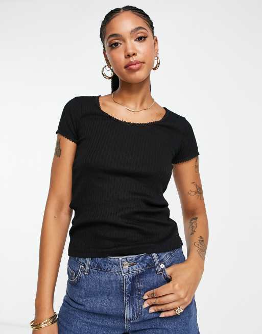 Topshop – Czarny T-shirt z ażurowej dzianiny z koronką