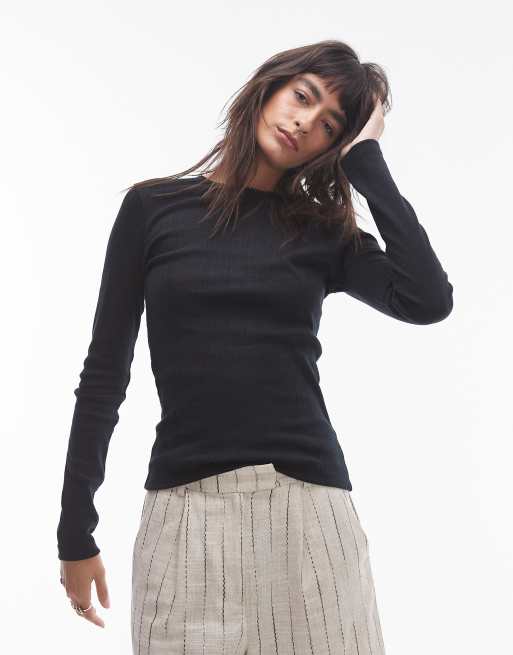 Topshop – Czarny top z długimi rękawami o splocie pointelle z pikotką