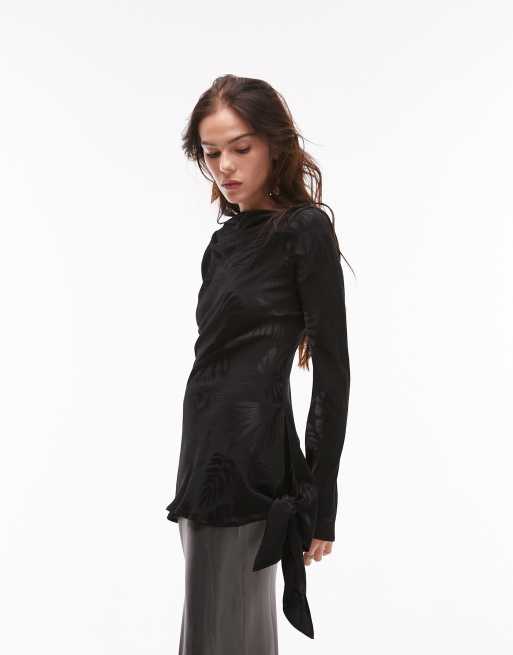 Topshop – Czarny żakardowy top z rozszerzanymi rękawami