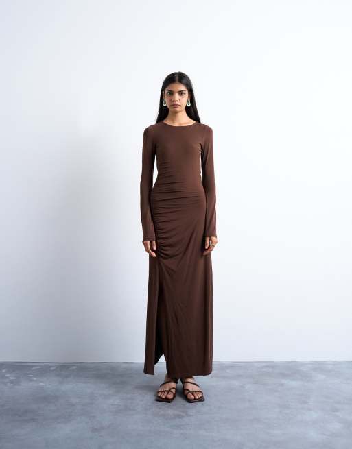 Topshop – Czekoladowa marszczona sukienka maxi z długimi rękawami