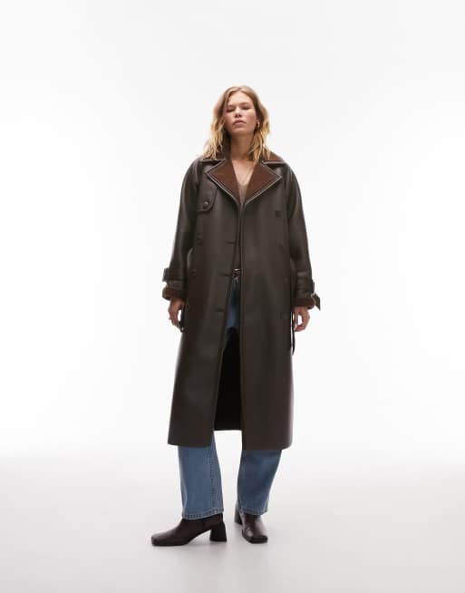 Topshop – Czekoladowobrązowy prochowiec z imitacji skóry ze sztucznym kożuszkiem