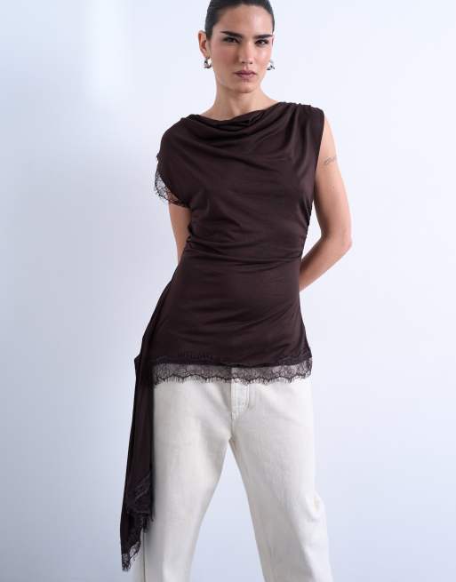 Topshop – Czekoladowy top z drapowanym dekoltem i koronkowym wykończeniem