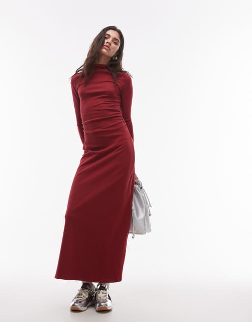 Topshop – Czerwona dżersejowa sukienka maxi z długimi rękawami i golfem