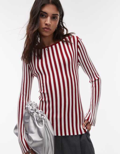 Topshop – Czerwono-ecru dzianinowy top z prostym dekoltem