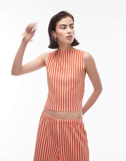 Topshop – Czerwony plisowany top z zabudowanym dekoltem w paski, część zestawu