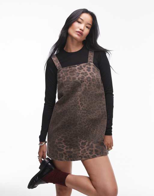 Topshop – Dopasowana jeansowa sukienka na szelkach we wzór w cętki