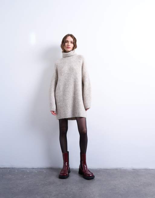 Topshop – Dzianinowa sukienka mini w kolorze owsa z odwijanym golfem
