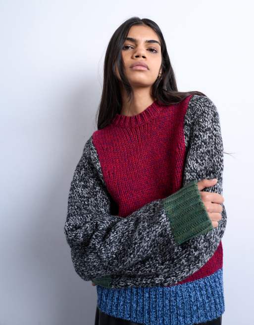 Topshop – Dzianinowy sweter patchworkowy z długimi, obszernymi rękawami