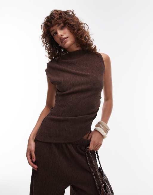 Topshop – Fakturowany czekoladowobrązowy podkoszulek bez rękawów z asymetrycznym marszczeniem, część zestawu