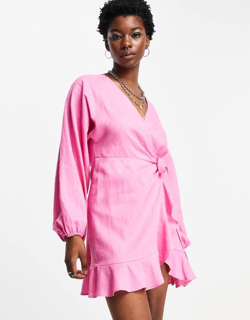 Topshop – Jaskraworóżowa kopertowa sukienka mini z obszernymi rękawami