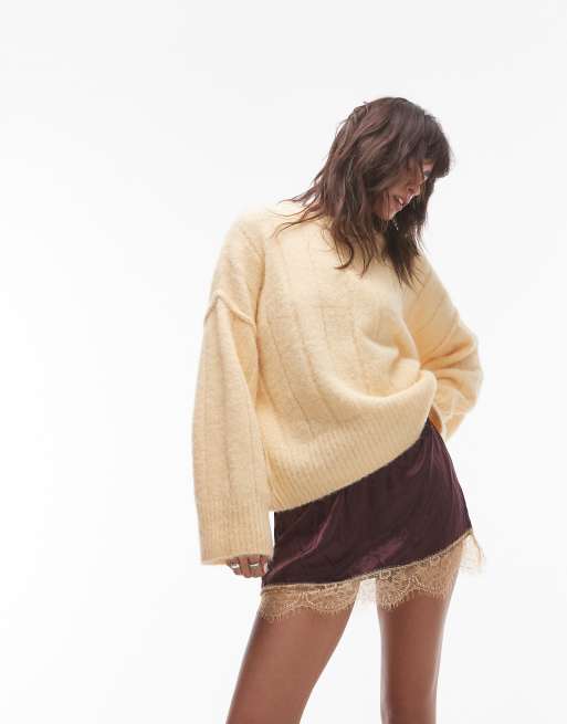 Topshop – Jasnożółty prążkowany sweter oversize z okrągłym dekoltem z puszystej dzianiny