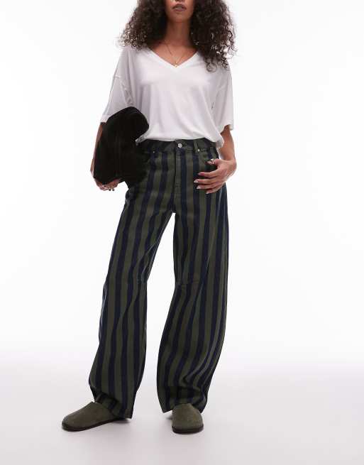 Topshop – Jeansy z baryłkowymi nogawkami i średnim stanem w paski w kolorze khaki