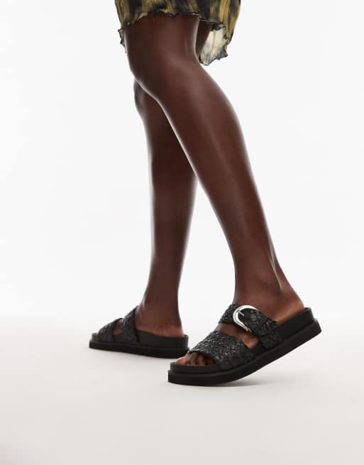 Topshop – Kady – Płaskie czarne sandały z plecionymi paskami z klamrami