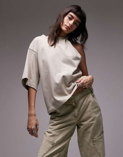 Topshop – Kamiennobeżowy T-shirt oversize premium ze skręconym detalem