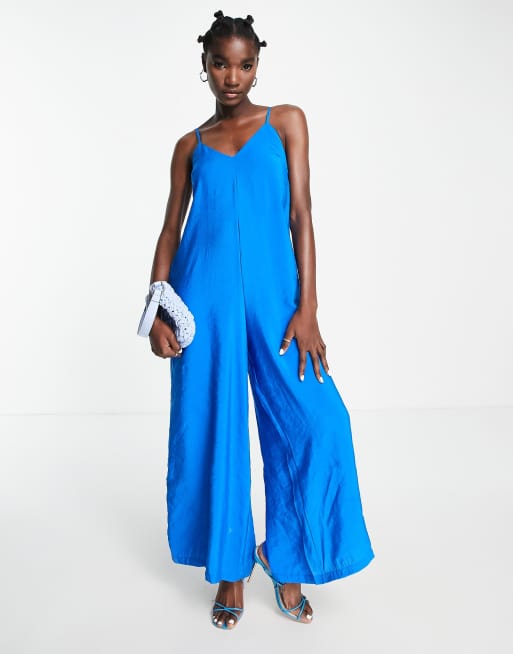 Topshop – Kobaltowy kombinezon na ramiączkach z szerokimi nogawkami i odkrytymi plecami