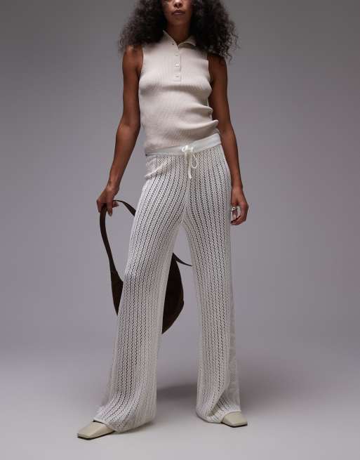 Topshop – Kremowe dzianinowe ażurowe spodnie ze wstawką w haftowany wzór