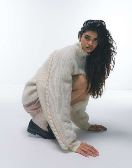 Topshop – Kremowy sweter z golfem z dzianiny o wypukłym warkoczowym splocie