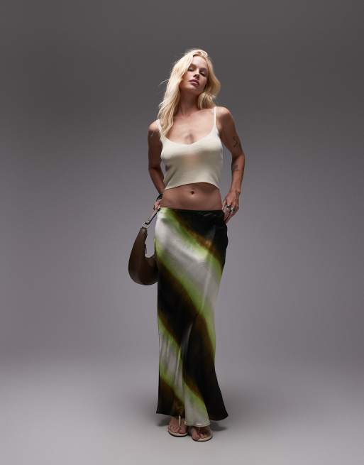 Topshop – Limonkowa satynowa spódnica maxi ze skosu w paski z efektem ombre