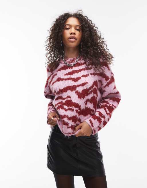 Topshop – Luźny sweter z puszystej dzianiny w różowo-czerwone paski zebry