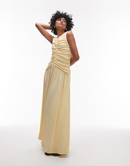 Topshop – Marszczona kremowa sukienka maxi z obniżonym stanem