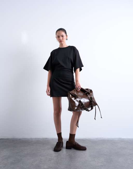 Topshop – Marszczona w talii czarna sukienka mini z raglanowymi rękawami