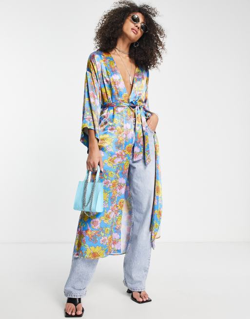 Topshop – Niebieska sukienka kimonowa o długości midi ze wzorem w kwiaty