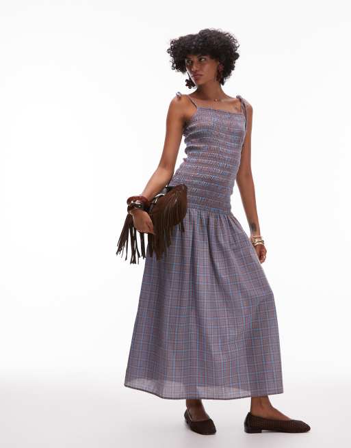 Topshop – Niebieska sukienka midi na ramiączkach, z marszczeniem, w kratę