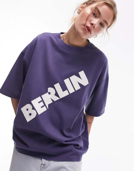 Topshop – Niebieski T-shirt oversize z obniżoną linią ramion i napisem „Berlin”