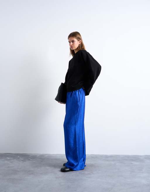 Te spodnie zostały uszyte z błyszczącego materiału w stylu satyny w żywym niebieskim kolorze. Mają wysoki stan, elastyczną talię, kieszenie po bokach i proste nogawki.Kod produktu: 148247982