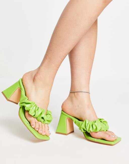 Topshop – Nori – Limonkowe sandały na obcasie klockowym z marszczonym paskiem