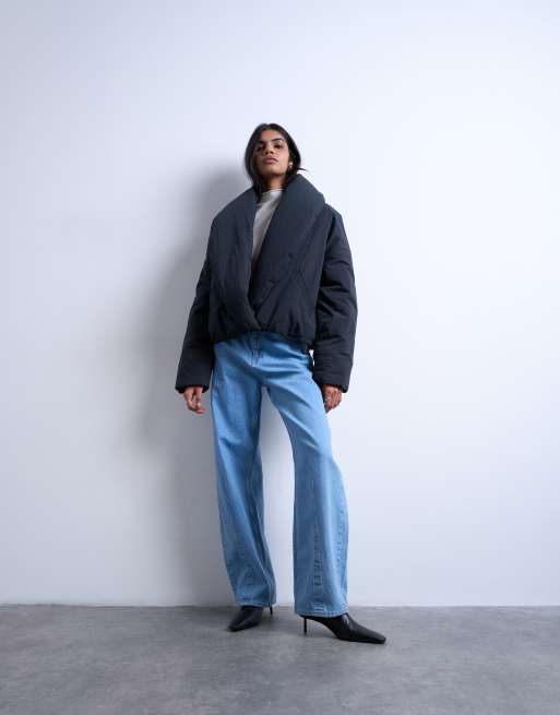 Topshop – Ocieplana kurtka z kołnierzem szalowym w spranym czarnym kolorze