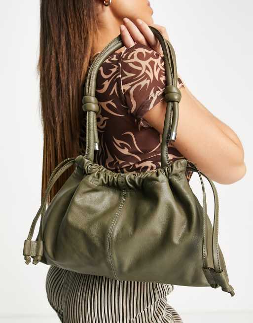 Topshop – Oliwkowa marszczona torebka na ramię ze skóry