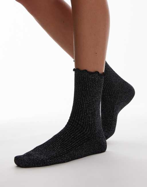 Topshop – Prążkowane brokatowe skarpetki z falbanką w czarnym kolorze
