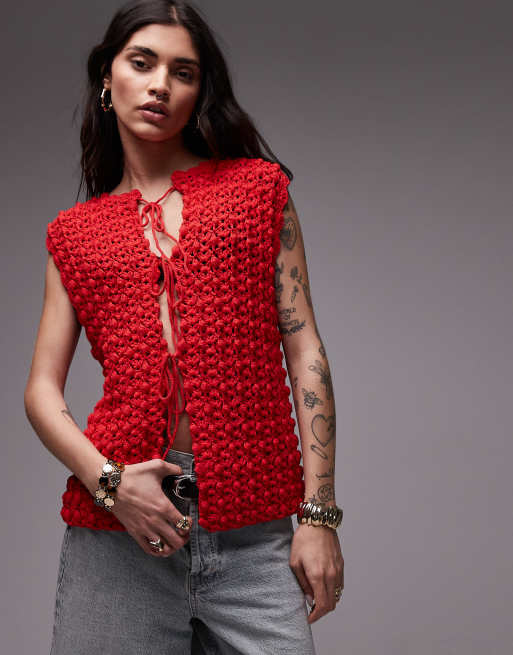 Topshop Premium – Czerwona dzianinowa kamizelka z wiązaniem