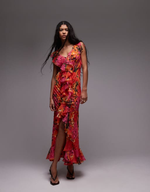 Topshop Premium – Czerwono-pomarańczowa suknia z falbankami i zaszewkami w kwiatowy wzór