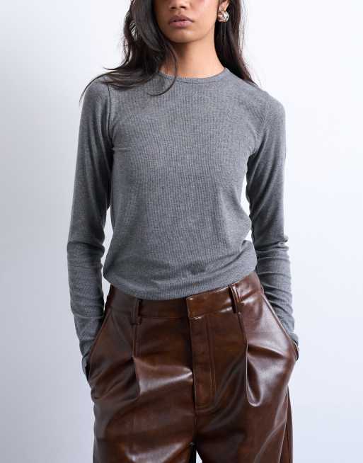 Topshop – Premium – Prążkowany top z długimi rękawami w szarym melanżowym kolorze