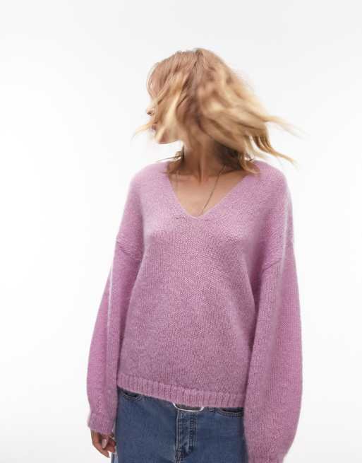 Topshop Premium – Różowy sweter z dekoltem w szpic z moherowej dzianiny