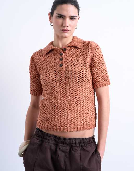 Topshop – Rdzawa koszulka polo z tasiemkowej przędzy
