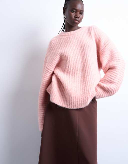 Topshop – Różowy sweter z prążkowanej dzianiny z balonowymi rękawami
