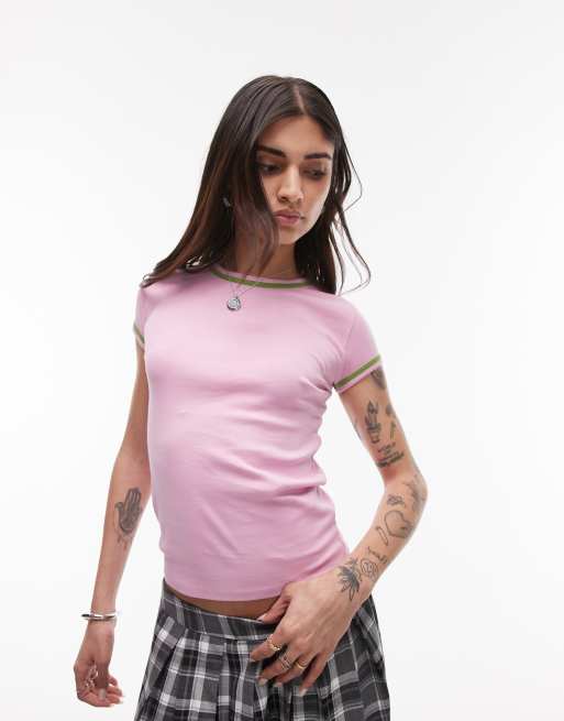 Topshop – Różowy T-shirt z kontrastową lamówką