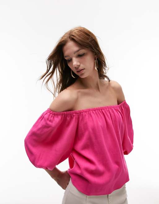 Topshop – Różowy top z dekoltem typu bardot z domieszką lnu