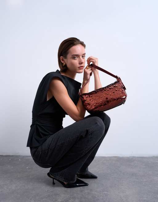 Topshop – Sol – Miedziana torebka na ramię z cekinami i skórzaną rączką